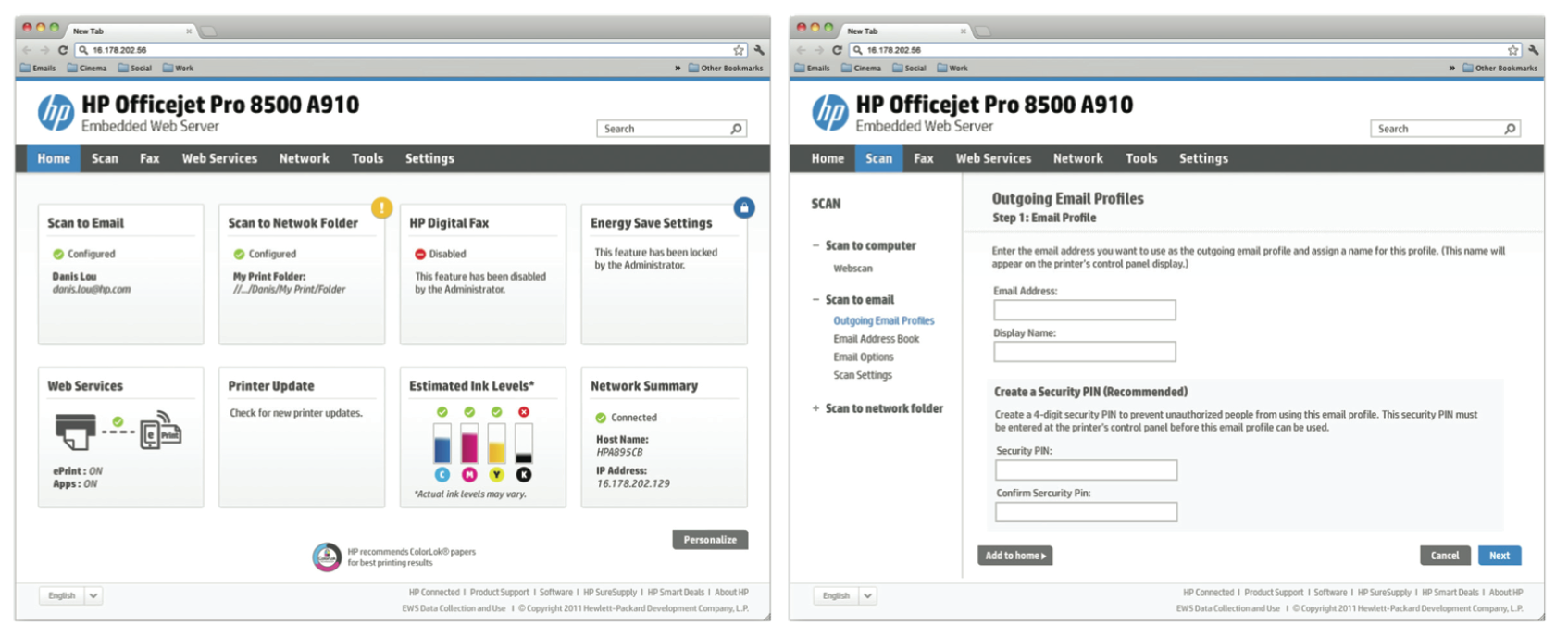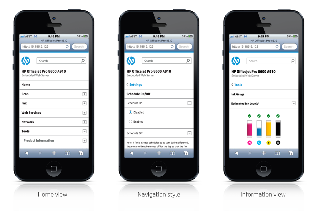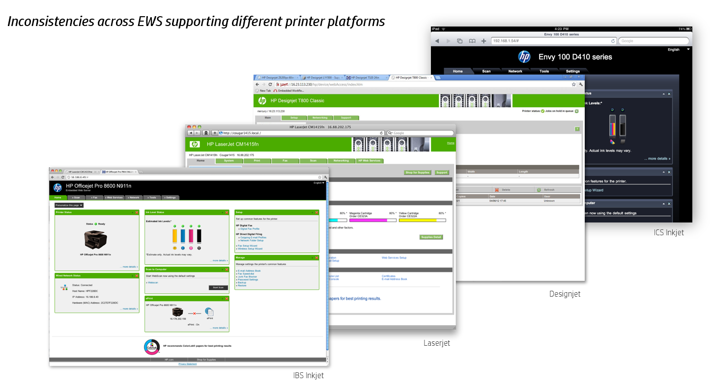 An application embedded into all HP printers (both ink and laser) that uses web technology to obtain status information and to configure printer settings. This tool can be opened by entering the IP of the printer in a web browser. To create EWS offering a unified experience across all HP printers. The EWS supports a flexible system, able to react to the user’s actions. It can detect the medium where it is currently being accessed, changing to provide the best experience possible to the user, both in terms of navigability and readability. The future of the EWS is not only desktop-based but is also optimized for tablets and smartphones.