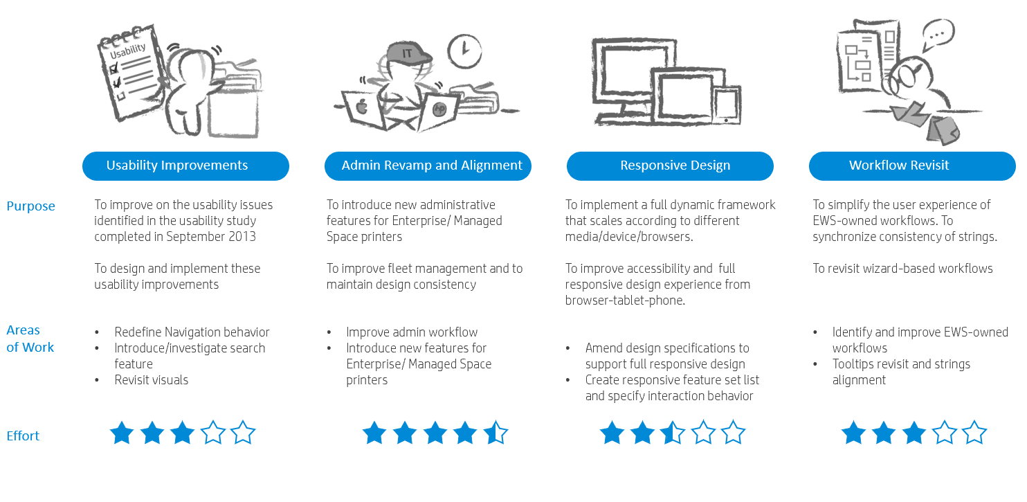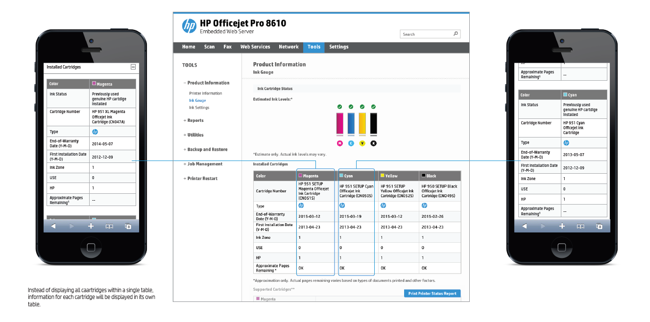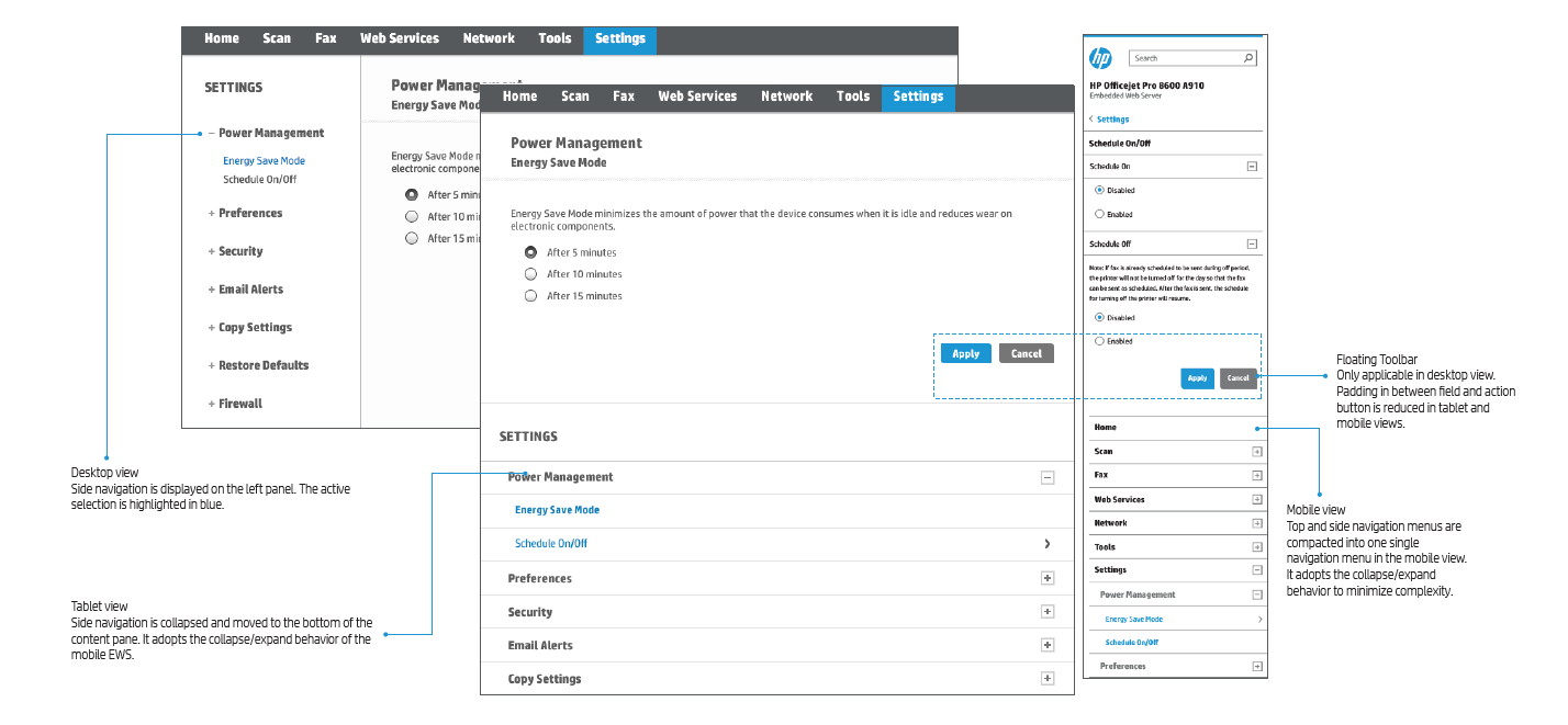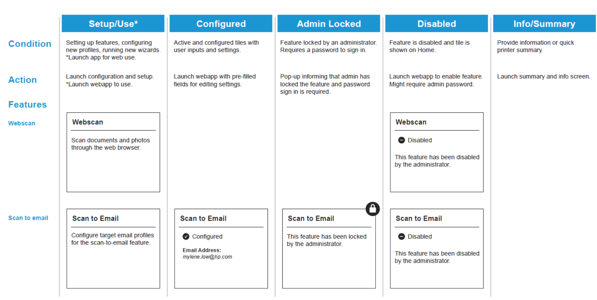 An application embedded into all HP printers (both ink and laser) that uses web technology to obtain status information and to configure printer settings. This tool can be opened by entering the IP of the printer in a web browser. To create EWS offering a unified experience across all HP printers. The EWS supports a flexible system, able to react to the user’s actions. It can detect the medium where it is currently being accessed, changing to provide the best experience possible to the user, both in terms of navigability and readability. The future of the EWS is not only desktop-based but is also optimized for tablets and smartphones.