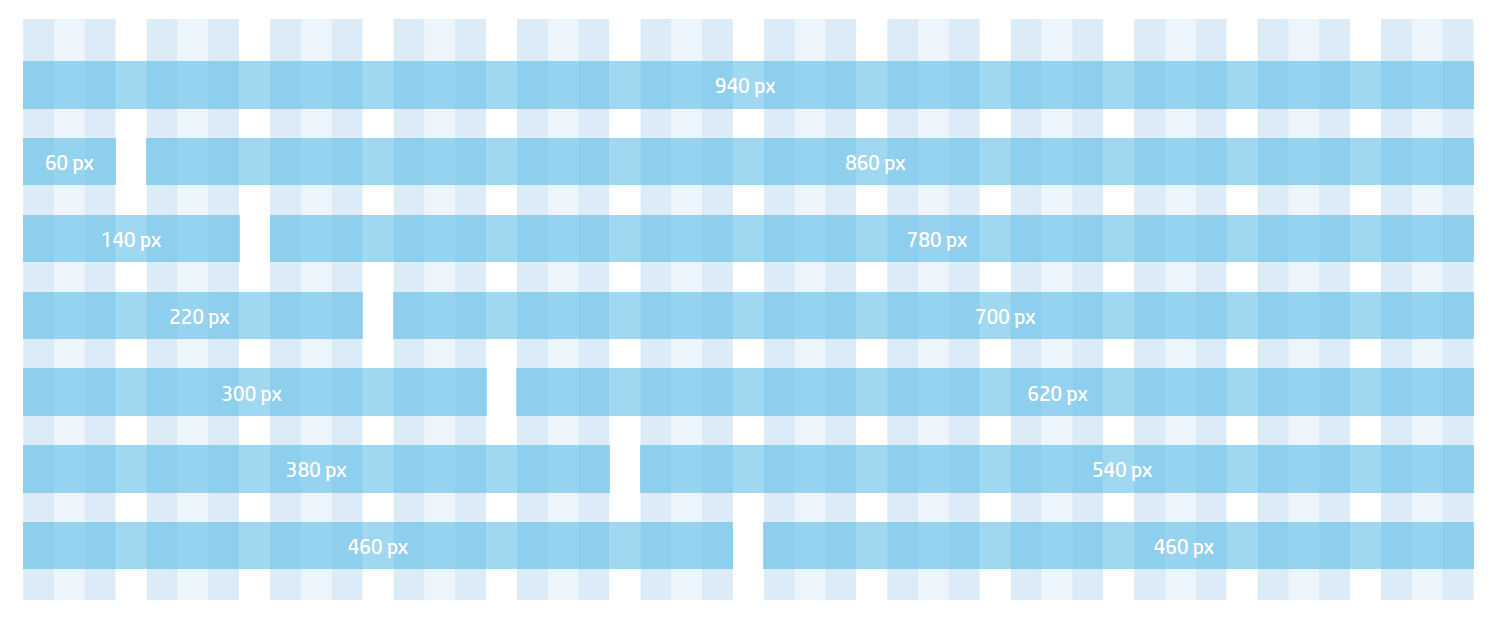 960 Grid System - The starting point is a universal 960-pixel divided into 12 columns. A 10 px margin is always placed at the right and left of the main content column. The narrowest column is 60 pixels wide. Each column after that increases by 80 pixels. (Available column widths are: 60, 140, 220, 300, 380, 460, 540, 620, 700, 780, 860 and 940.)