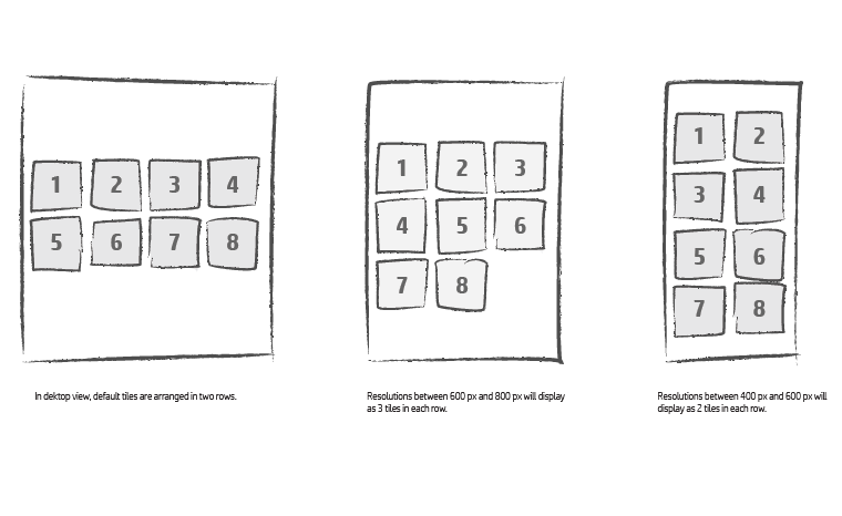 The following will describe the flexible grid and tile arrangement on the Home Dashboard page. As a standard rule of thumb, all home tiles are arranged from left to right and top to bottom. The Home Dashboard will display a minimum of 2 tiles in a row. It will not display any tiles when screen resolution is lower than the minimum 2 tiles.
